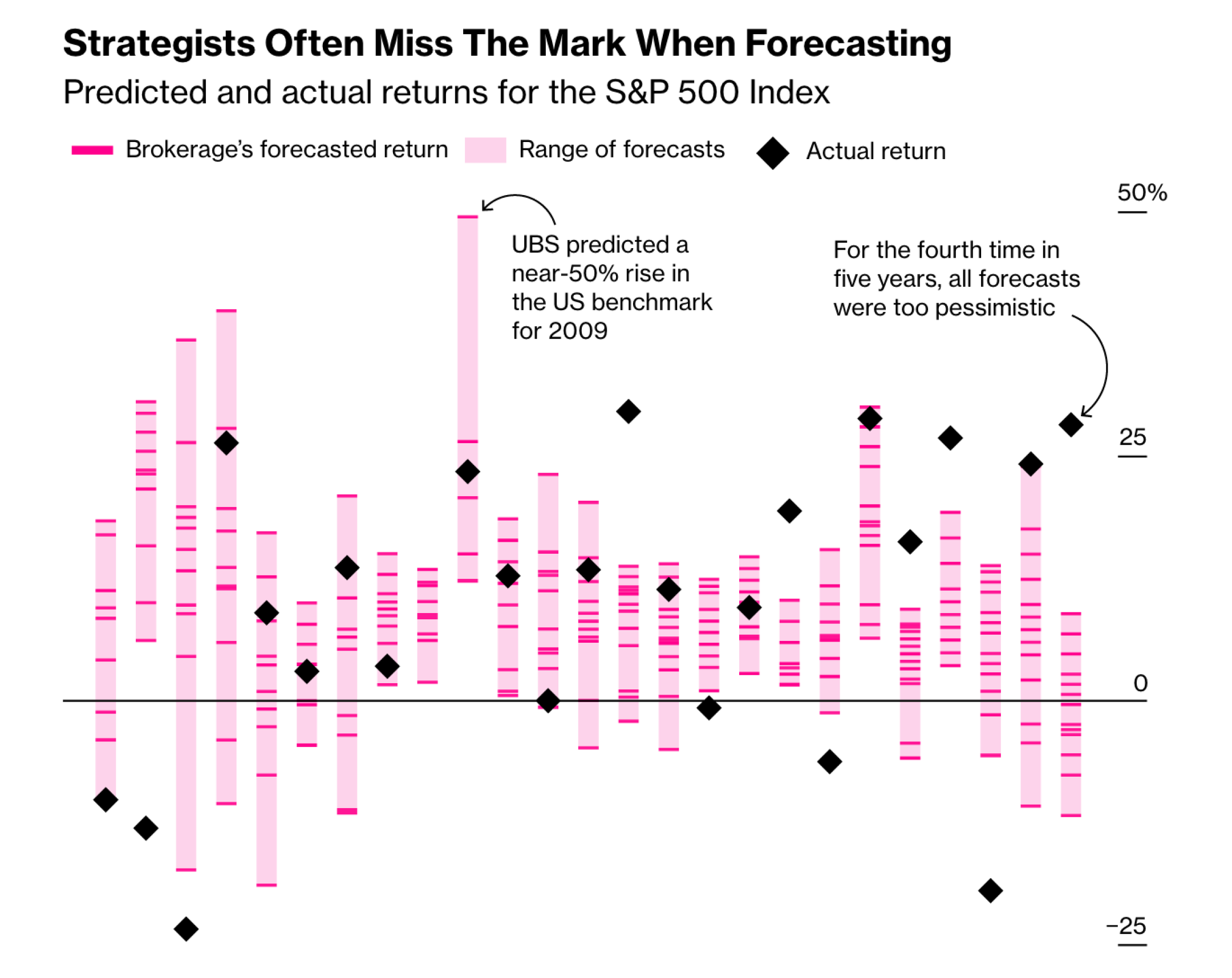 This image from Bloomberg shows the wide range of Wall Street’s predicted returns and what actually happened.